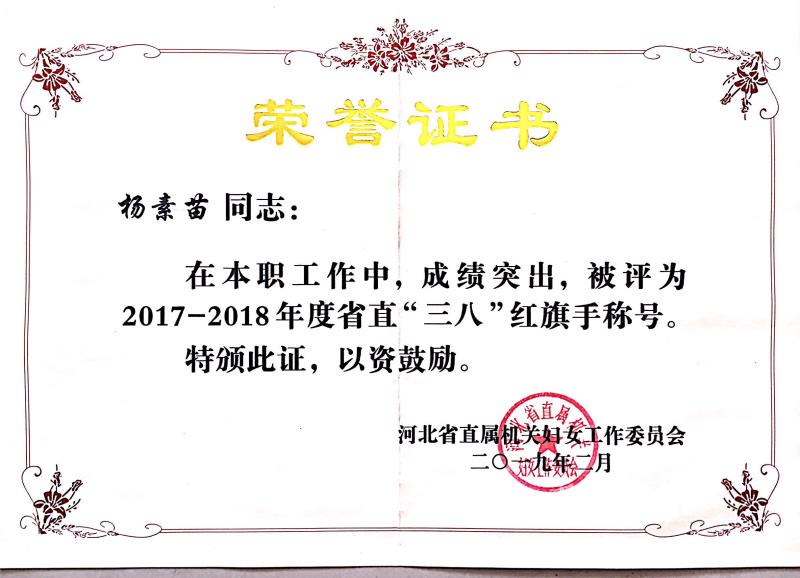 我所蘋果栽培研究室副主任楊素苗同志,在本職工作中,成績突出,于2019年2月被河北省直屬機關(guān)婦女工作委員會授予“2017-2018年度省直‘三八’紅旗手”榮譽稱號。